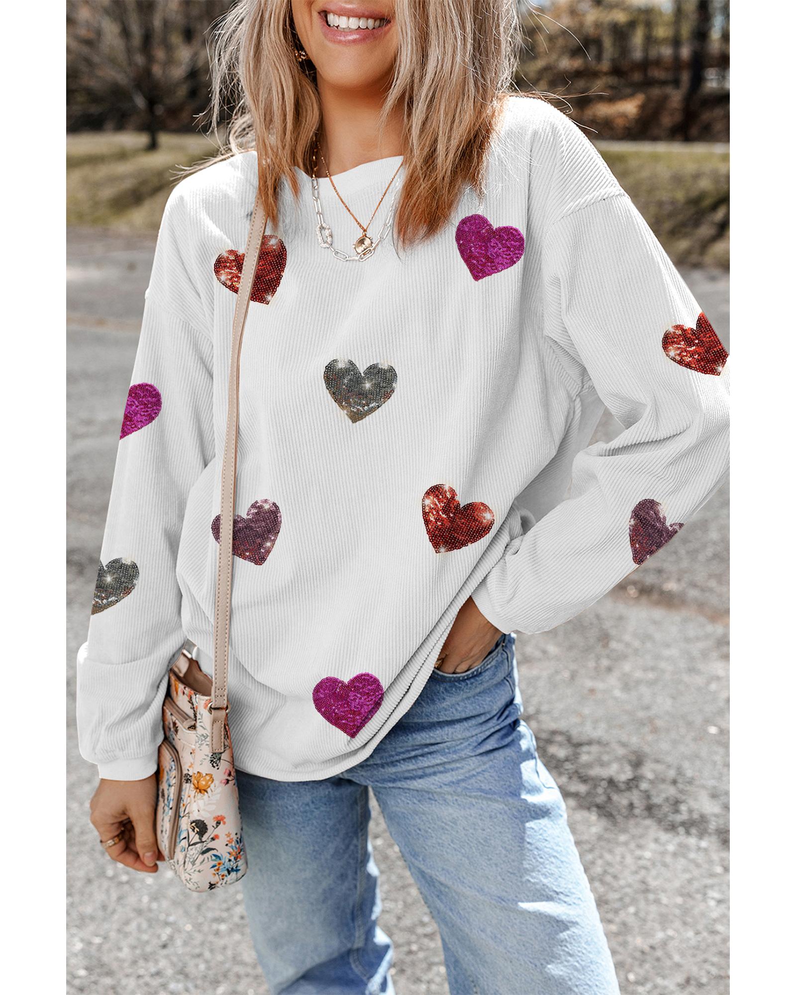 White Valentines Heart Patched Pattern Corded Pullover Sweatshirt – S