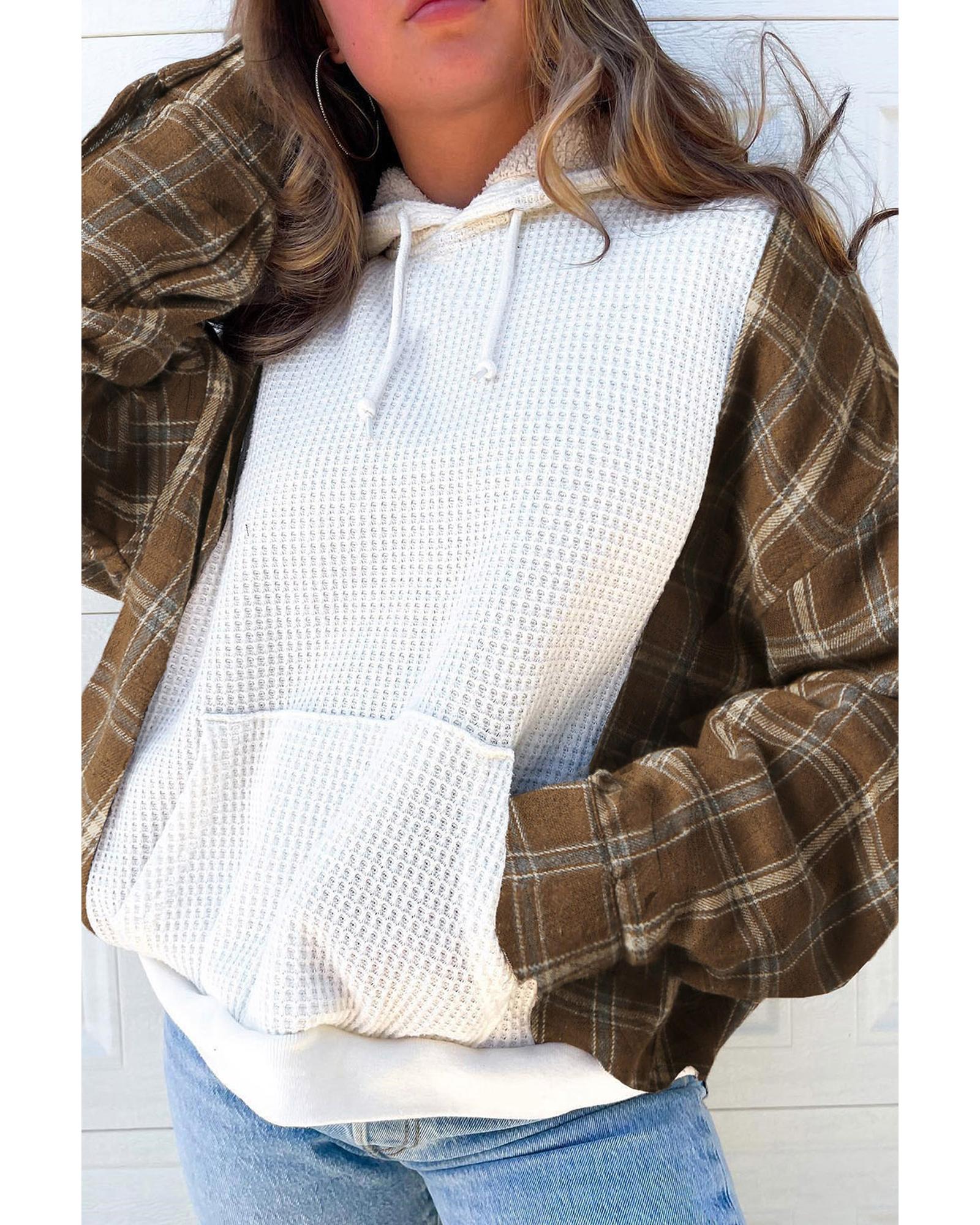 - White Waffle Patch Plaid Sleeve Kangaroo Pocket Hoodie