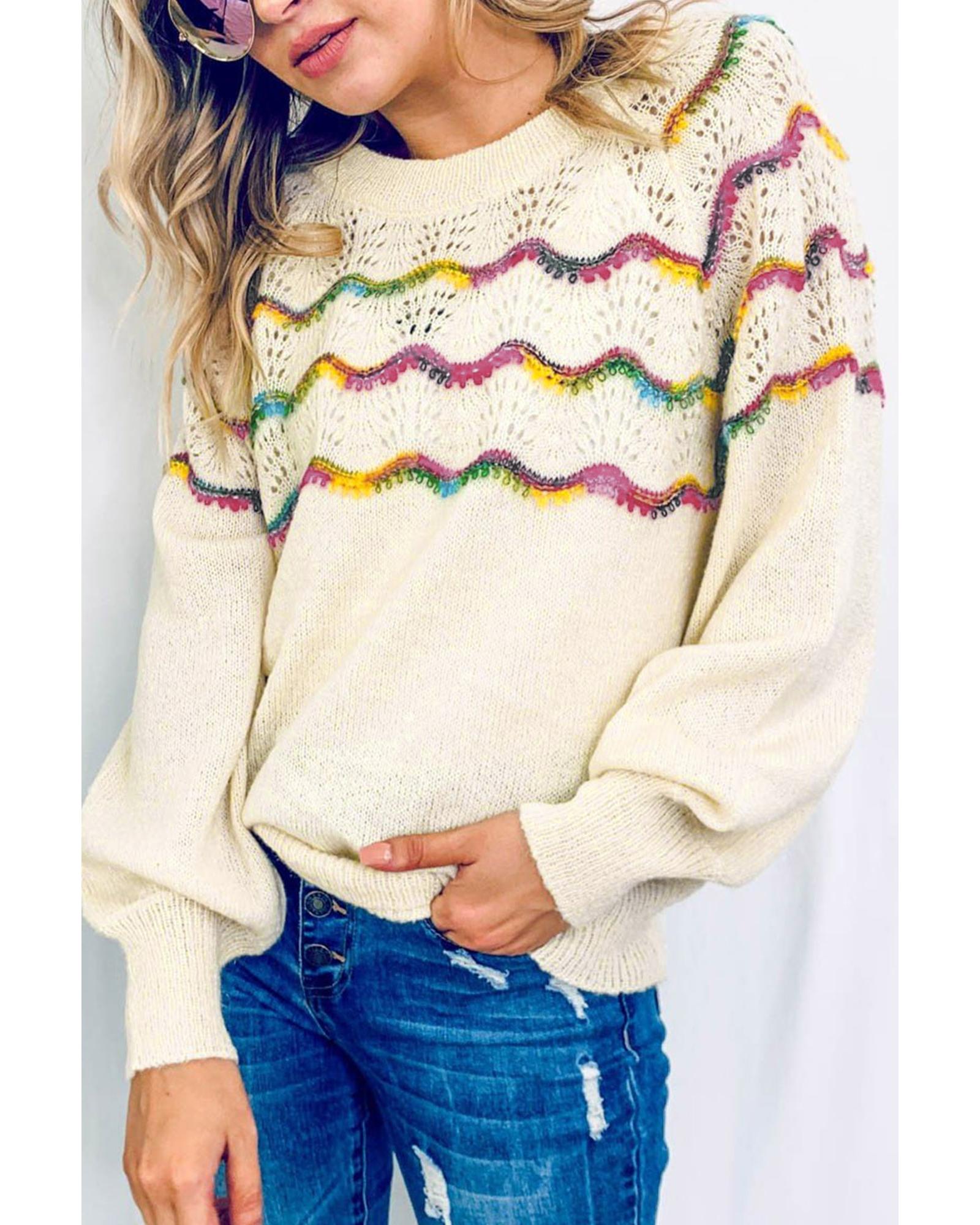 White Wavy Striped Pointelle Bishop Sleeve Sweater – S
