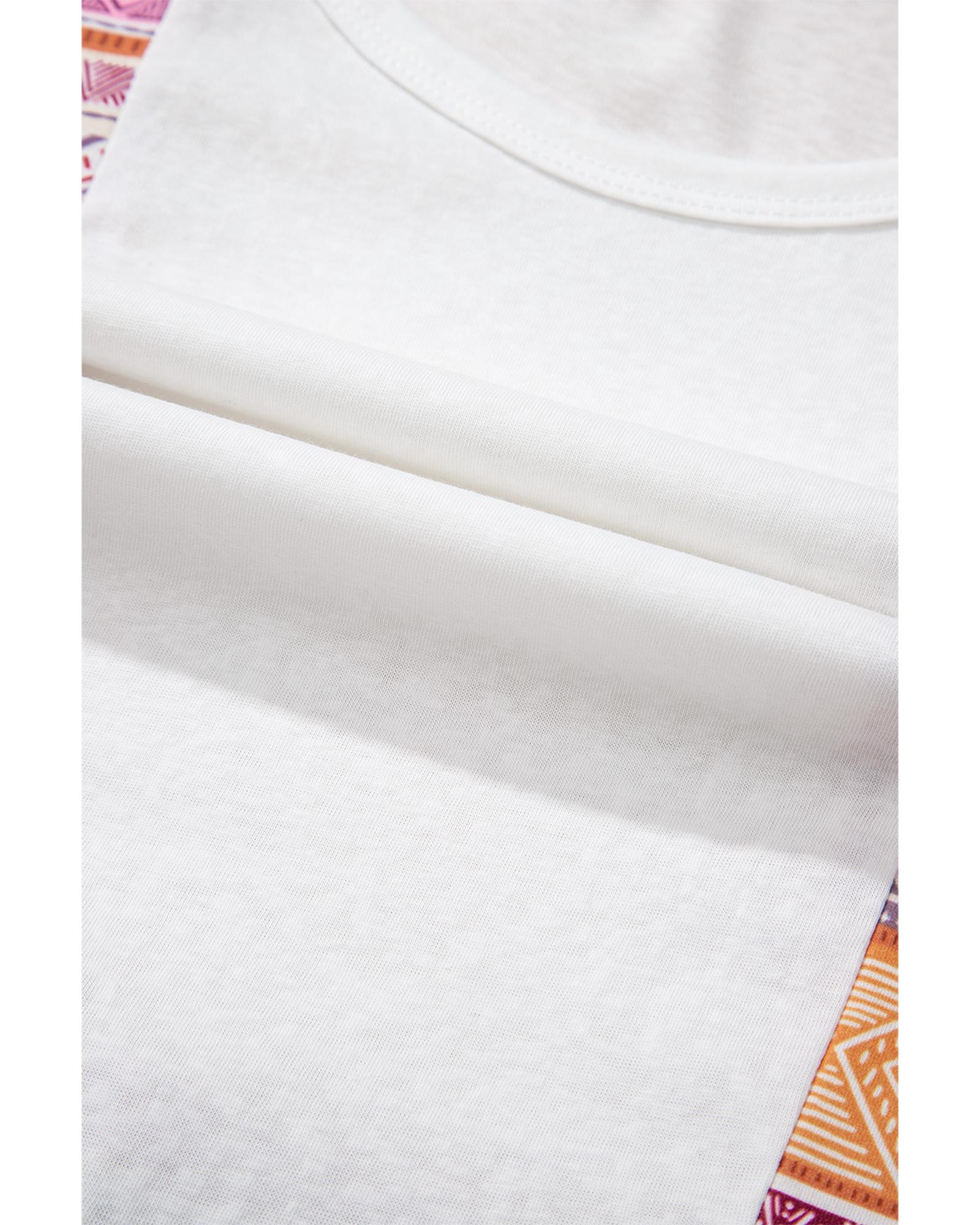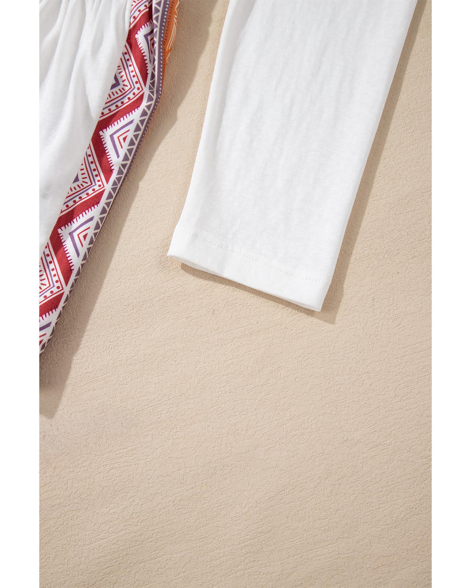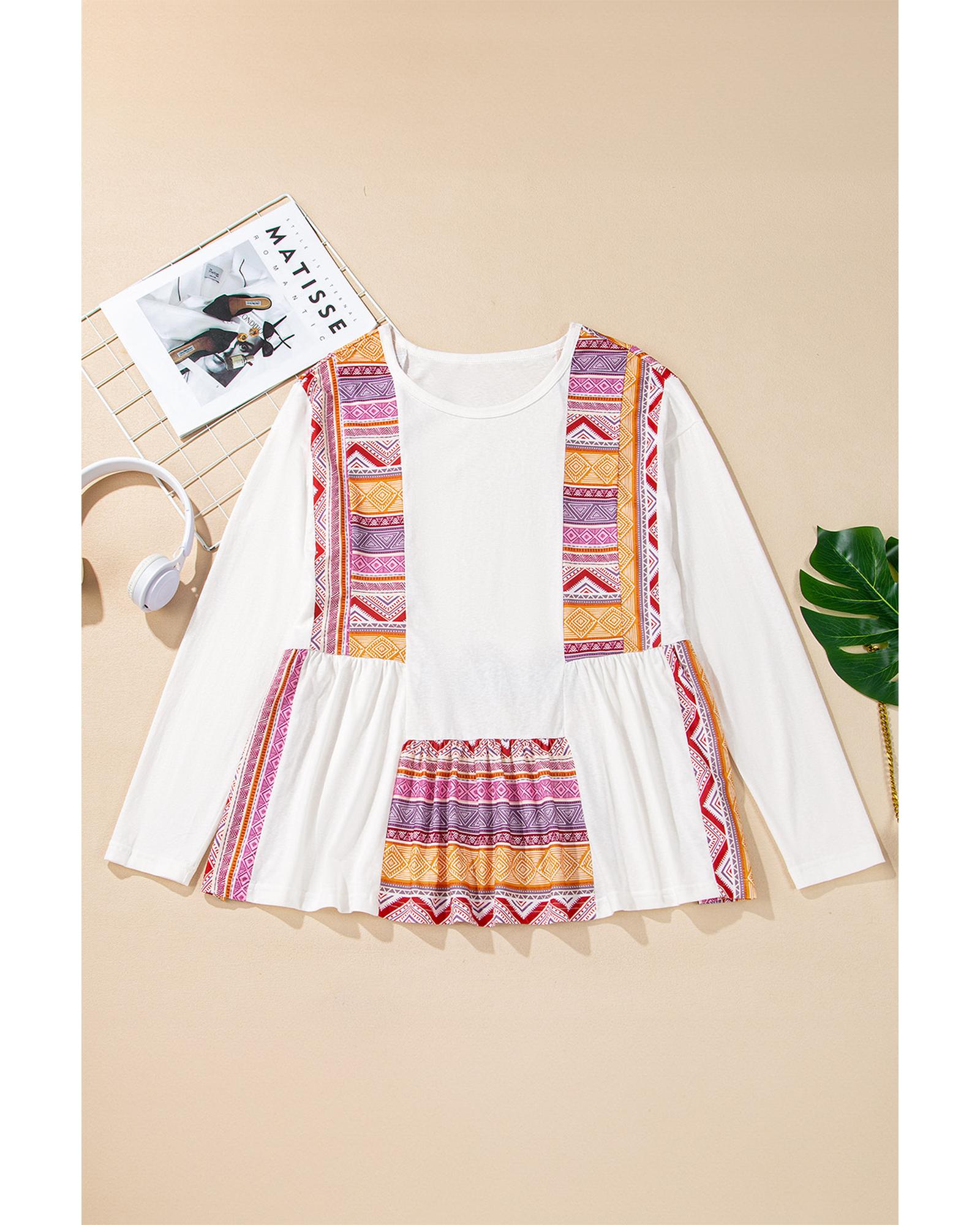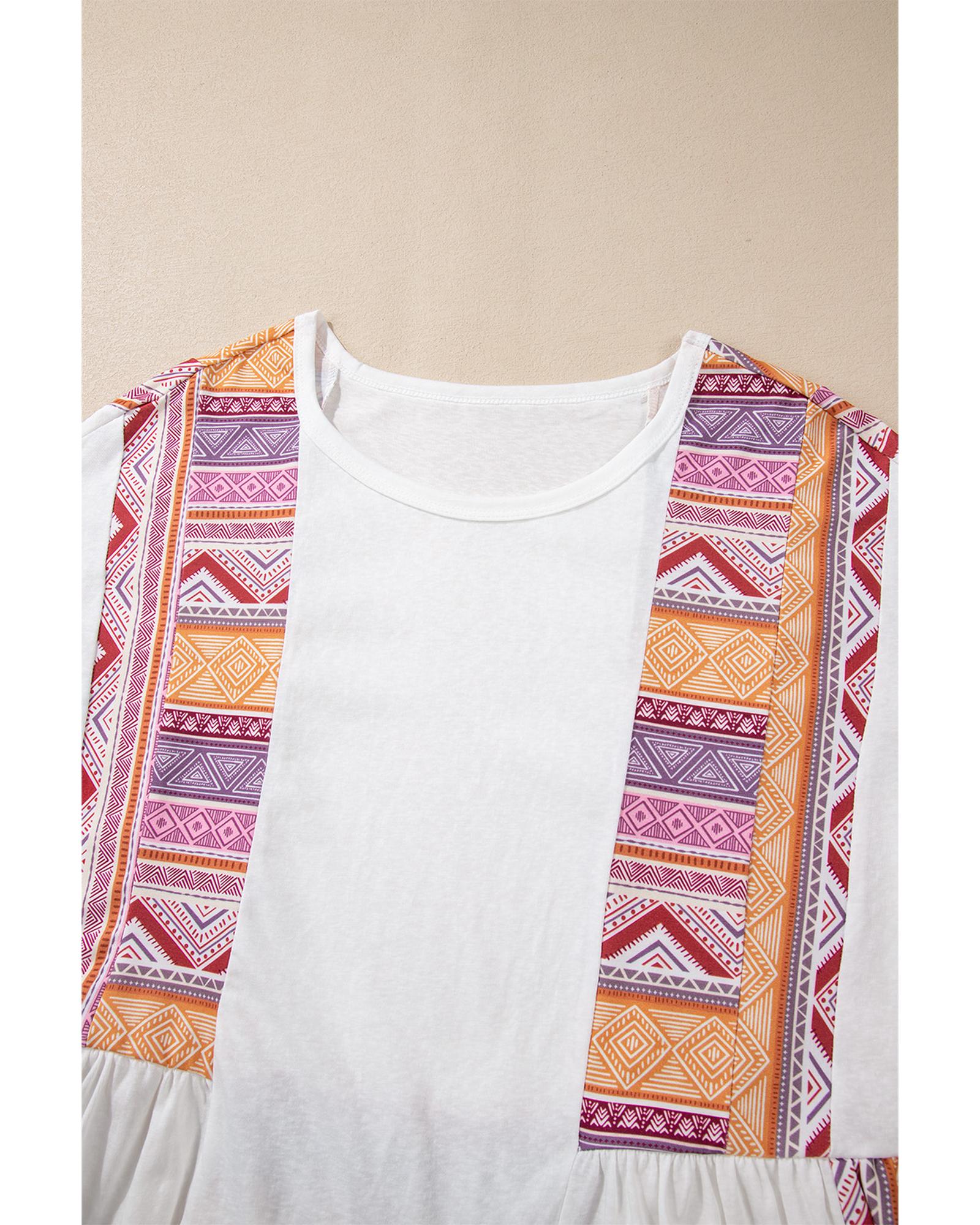 White Western Aztec Print Patchwork Ruffled Tunic Long Sleeve Babydoll Top – S