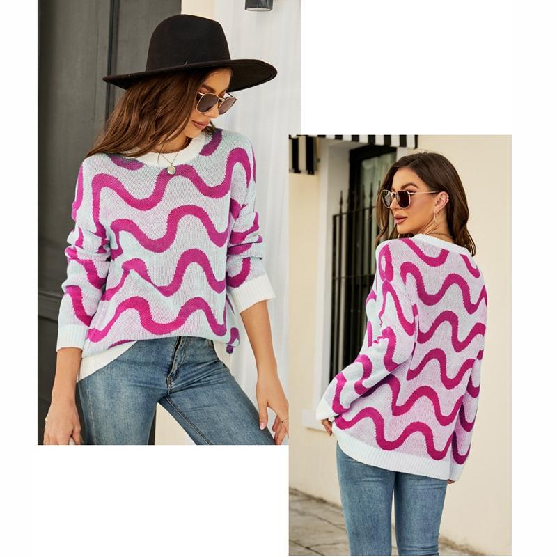 • 1 x Women Casual Pullover Sweater Round Neck Wave Pattern Collision Colour Knitted Sweater – Size Xl Black