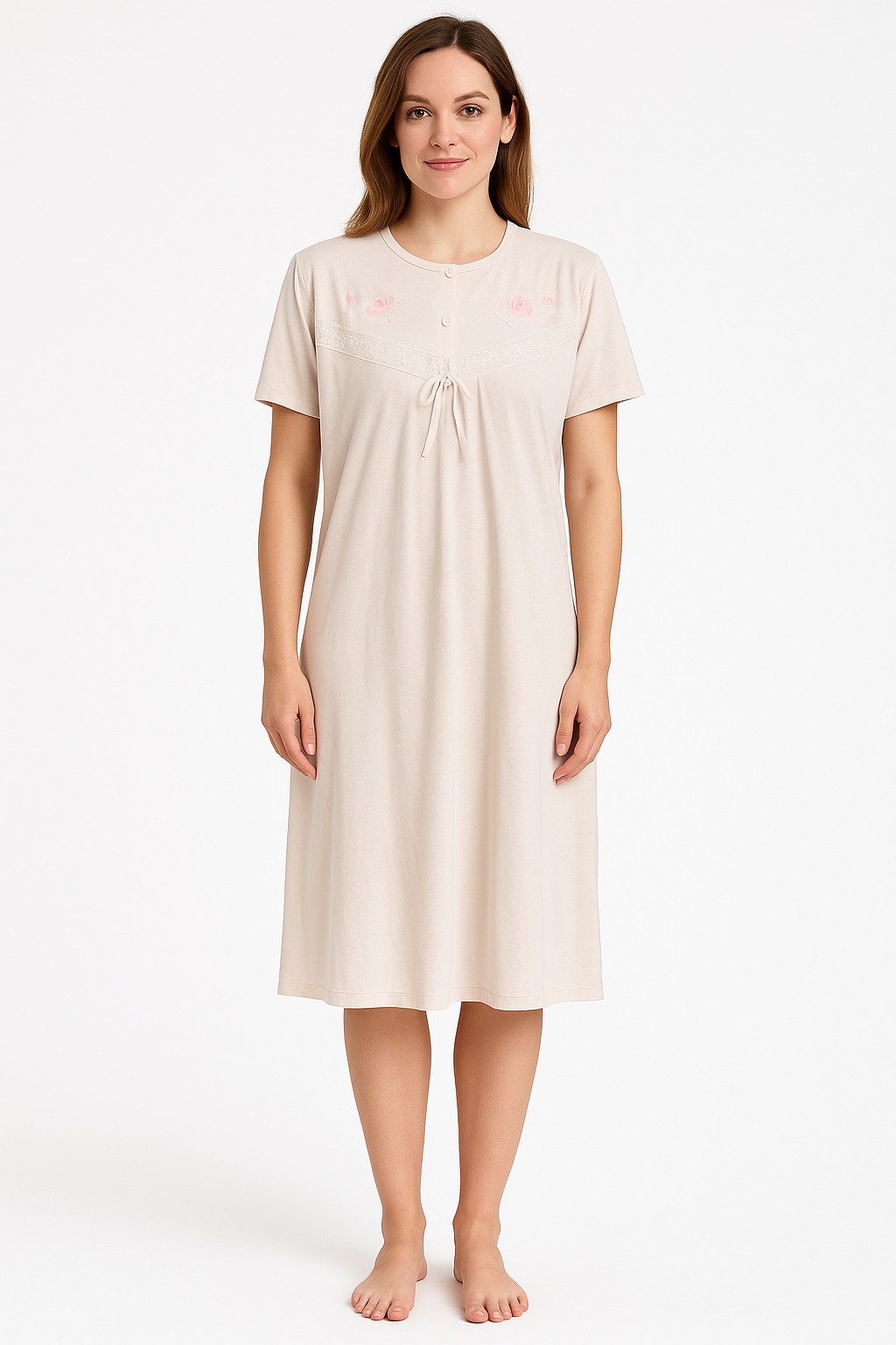 Slip into something wonderfully soft at the end of the day with this classic cotton blend nightie – your go-to for comfort, charm, and a great night’s sleep. With delicate lace and sweet embroidery stitched across the chest, this gown is as pretty as it is practical. Lightweight and breathable, it’s perfect for year-round lounging, whether you’re pottering around the house or winding down for the night.