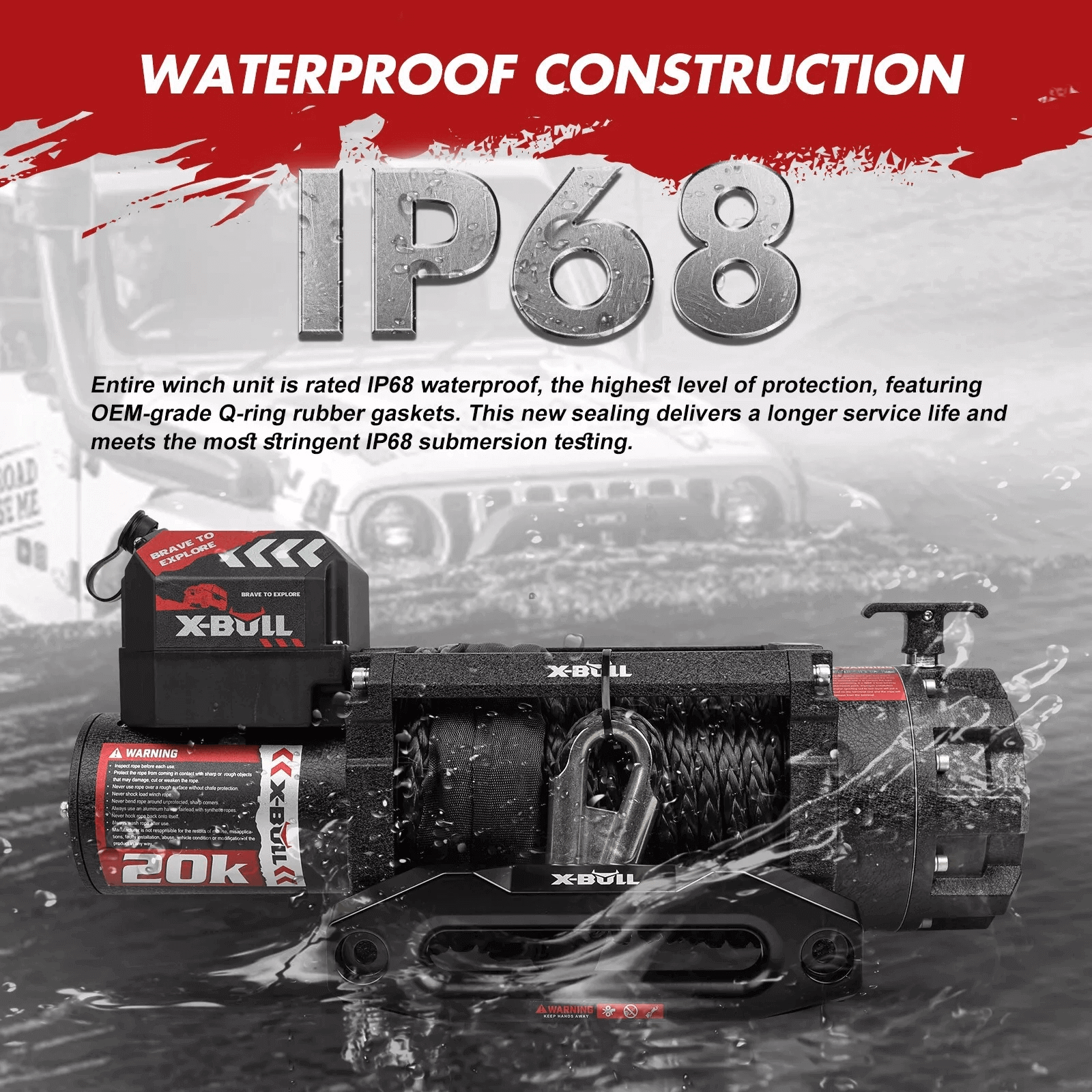 The X-BULL 20000lbs is one of our new X-BULL high-efficiency winches for all off-road and life-loving customers. This winch is equipped with an IP68 waterproof rating, capable of withstanding water, dust and dirt even in the most extreme off-road conditions. It is equipped with a 7.0hp/5.2kw pure copper motor, which can easily handle weights up to 20,000 pounds. The motor of the winch operates in series with a three-stage planetary gear system, providing an accurate transmission ratio of 354:1, specifically designed to handle demanding tasks. It offers both wired and wireless operation options, allowing for more flexible control of this winch. This winch fits a variety of off-road vehicles and offers an effective solution for diverse recovery situations.
