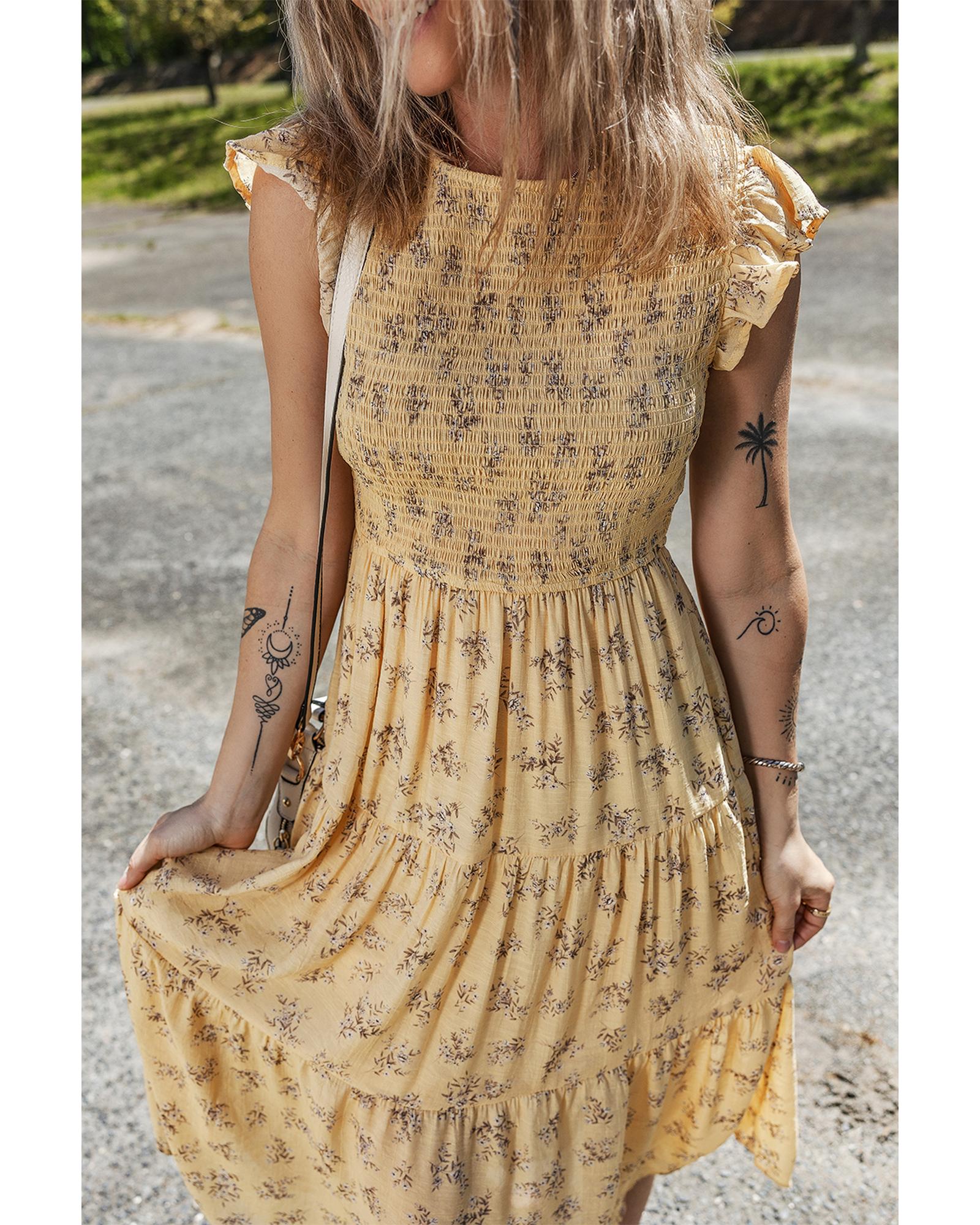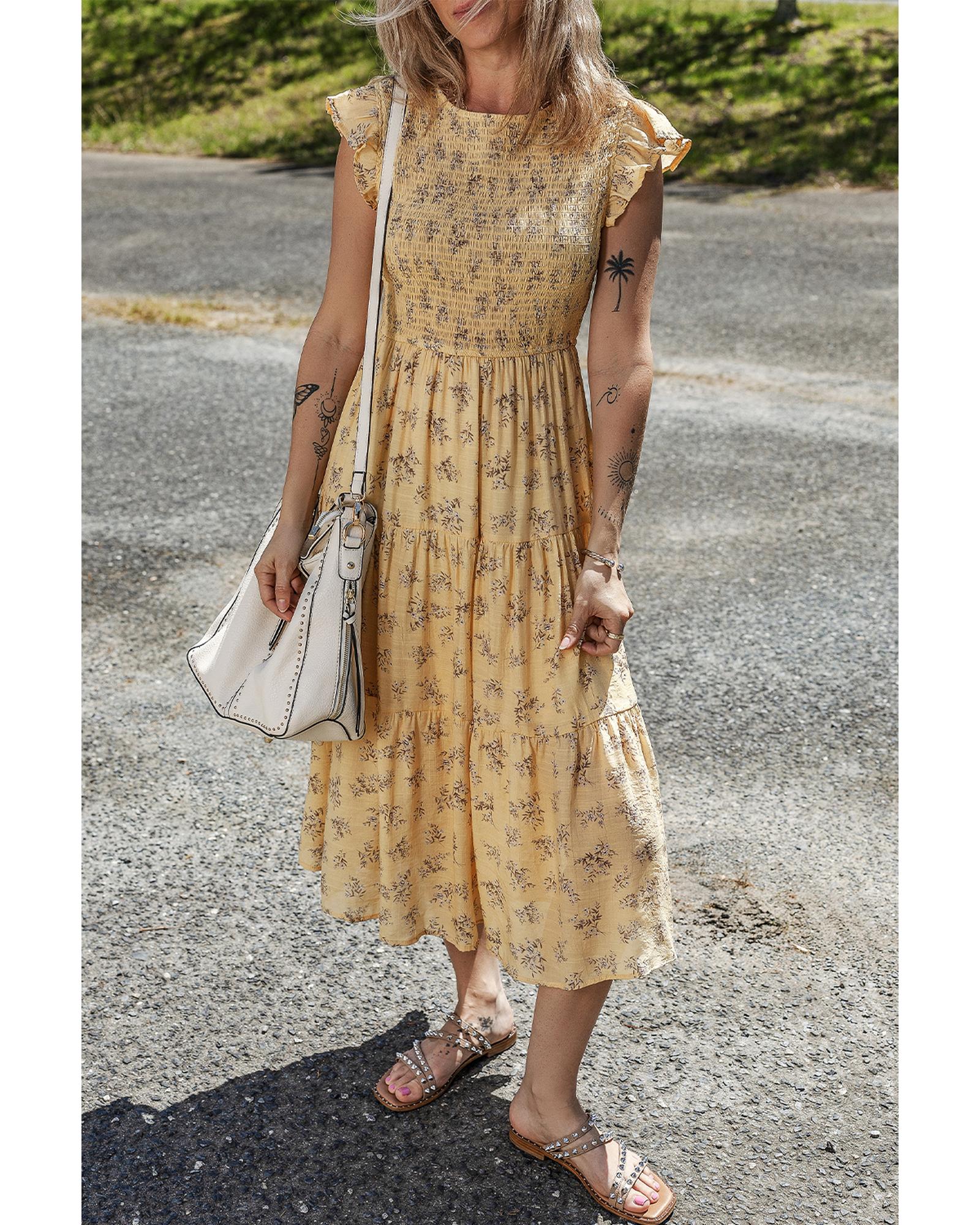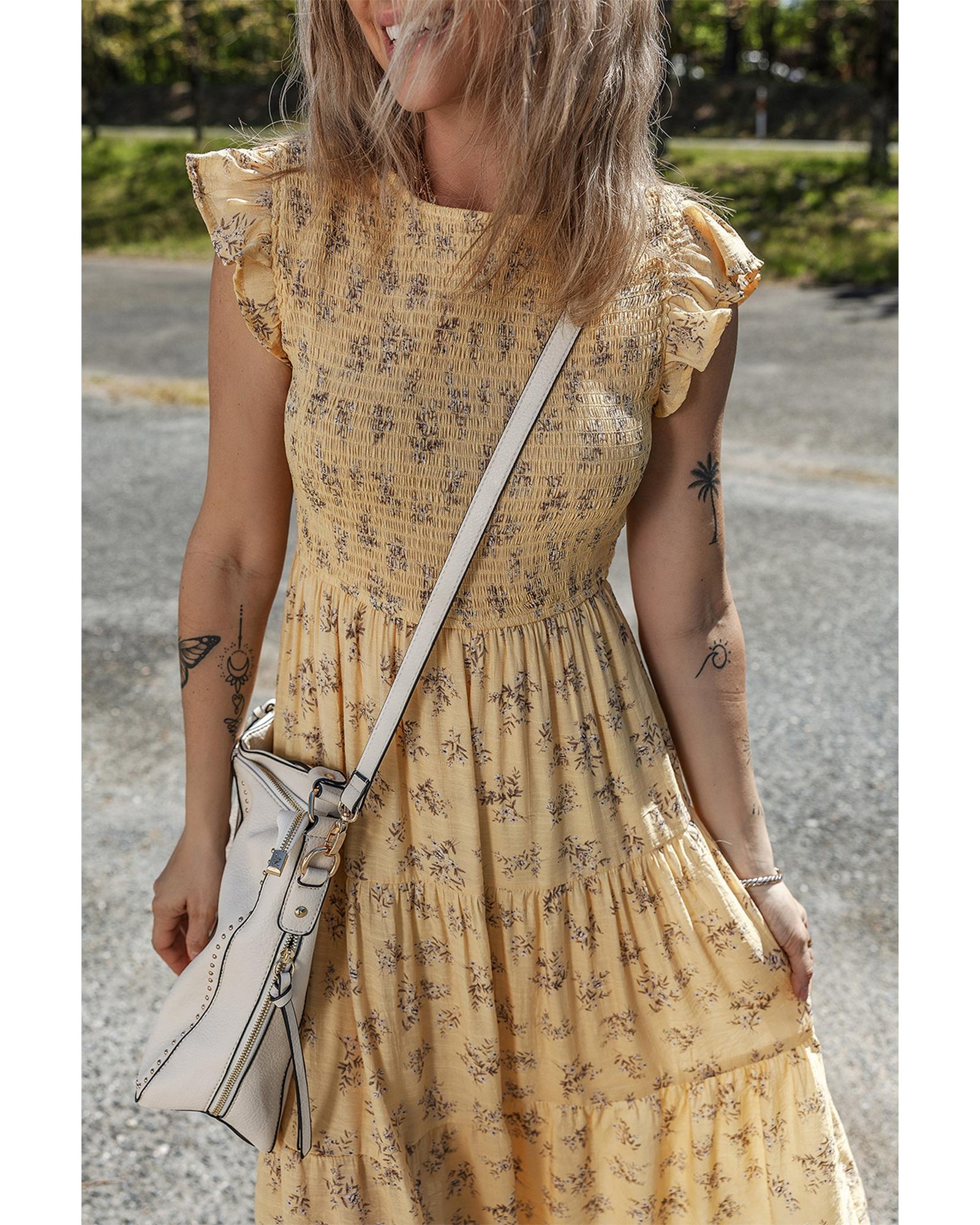 Yellow Boho Floral Print Ruffle Smocked Flowy Summer Dress – L