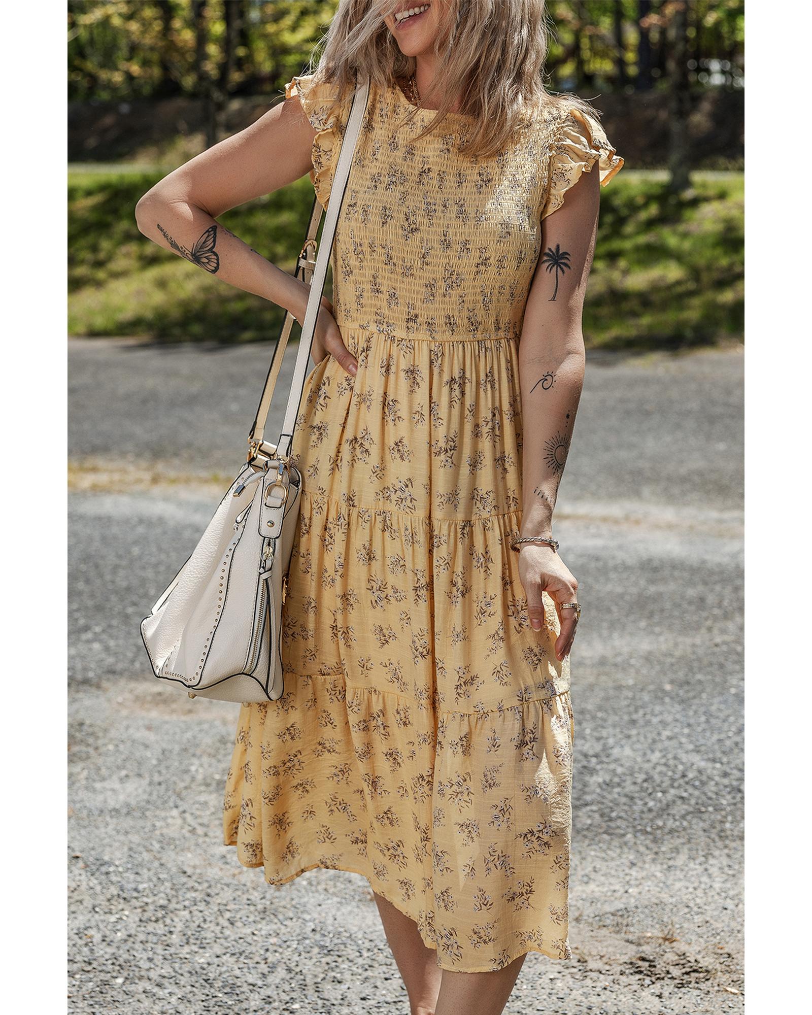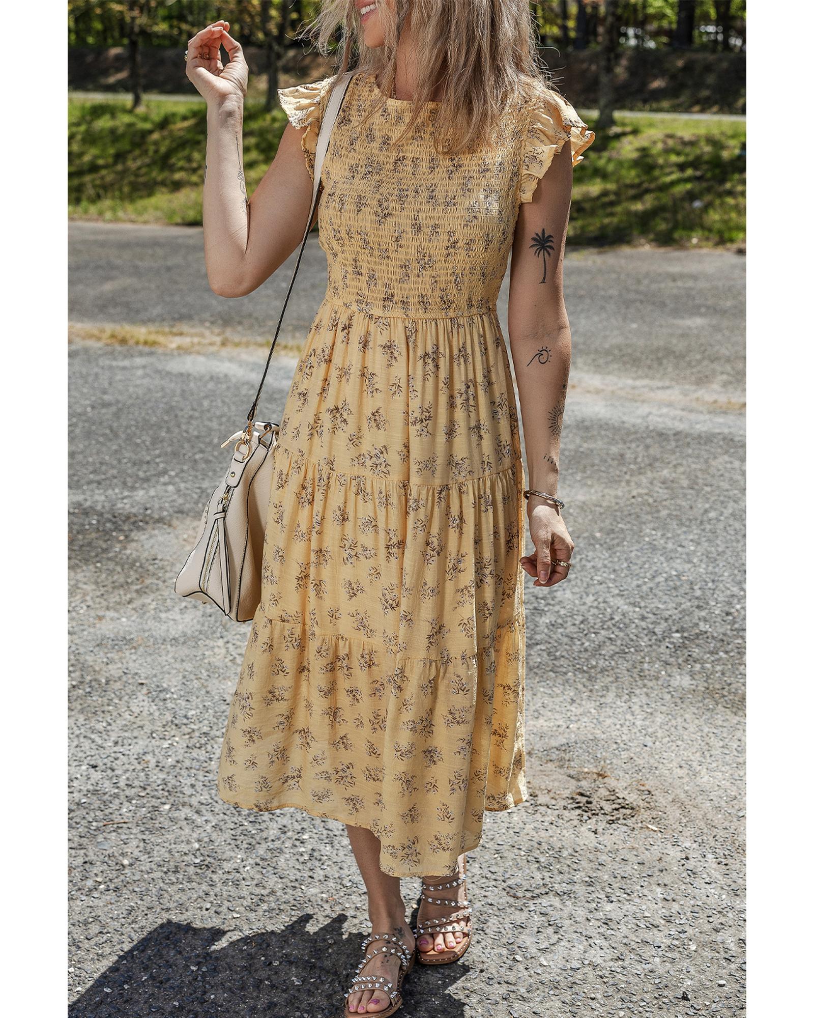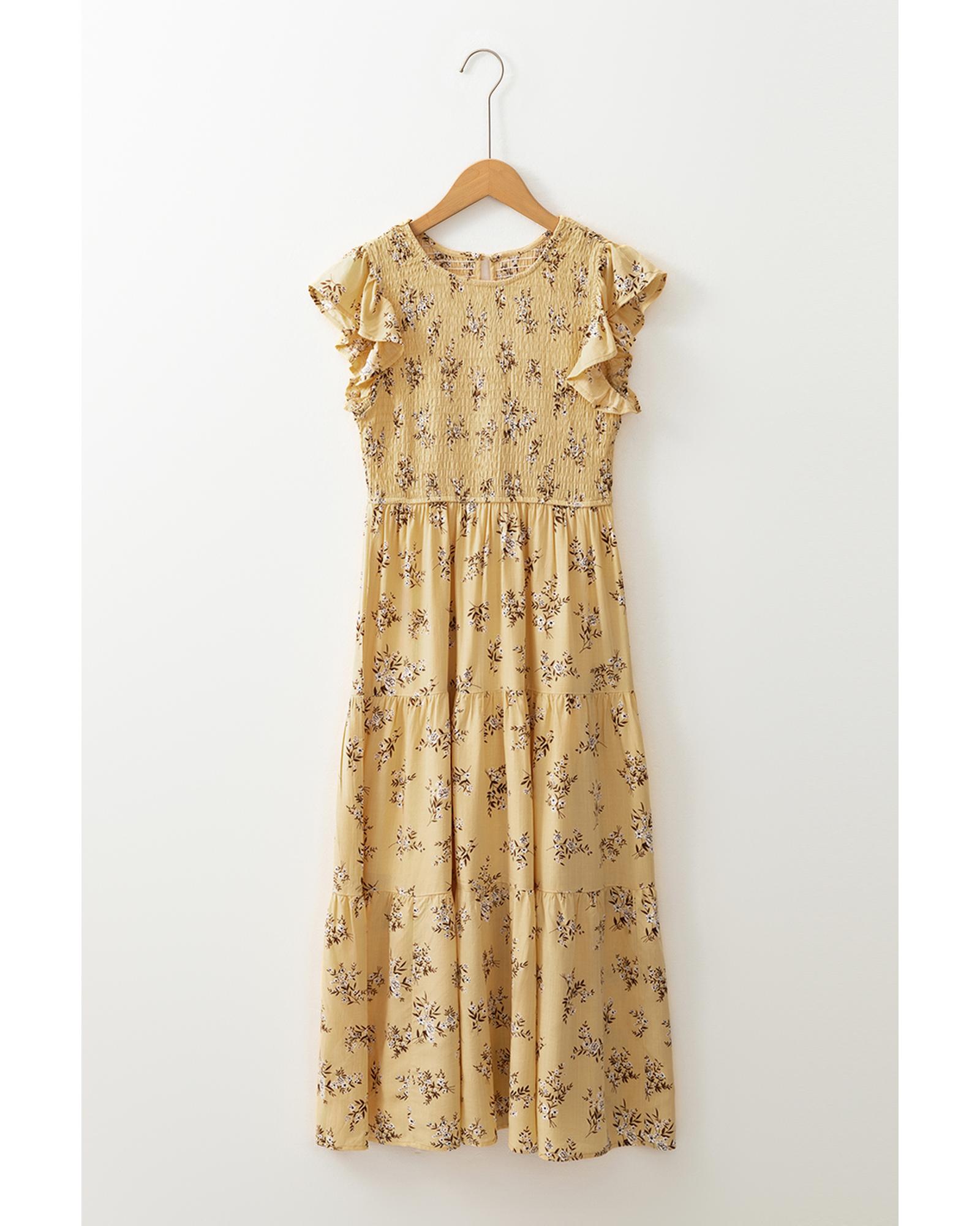 Yellow Boho Floral Print Ruffle Smocked Flowy Summer Dress – L