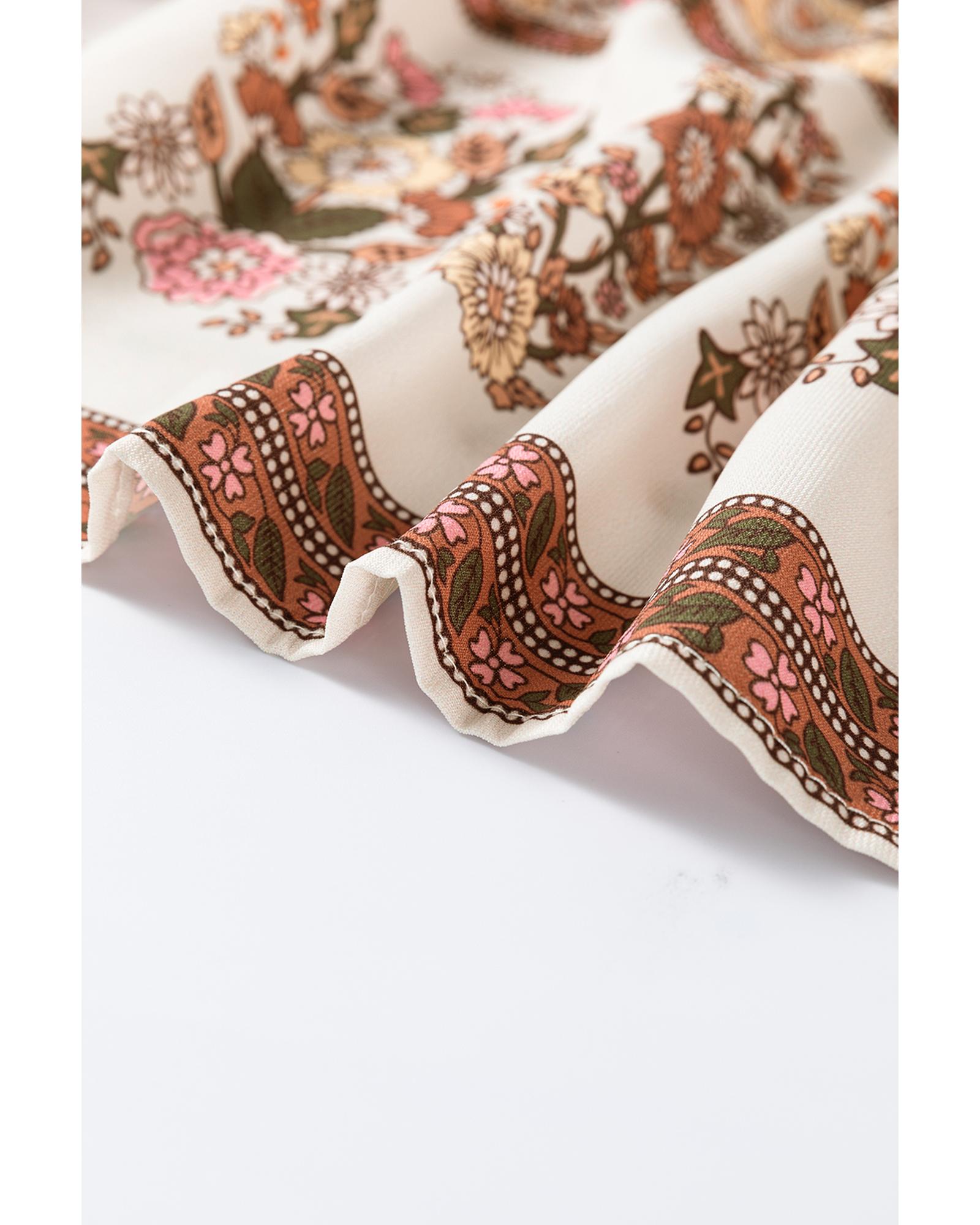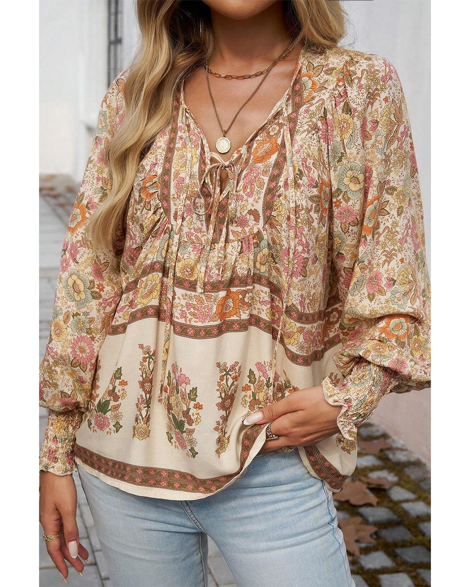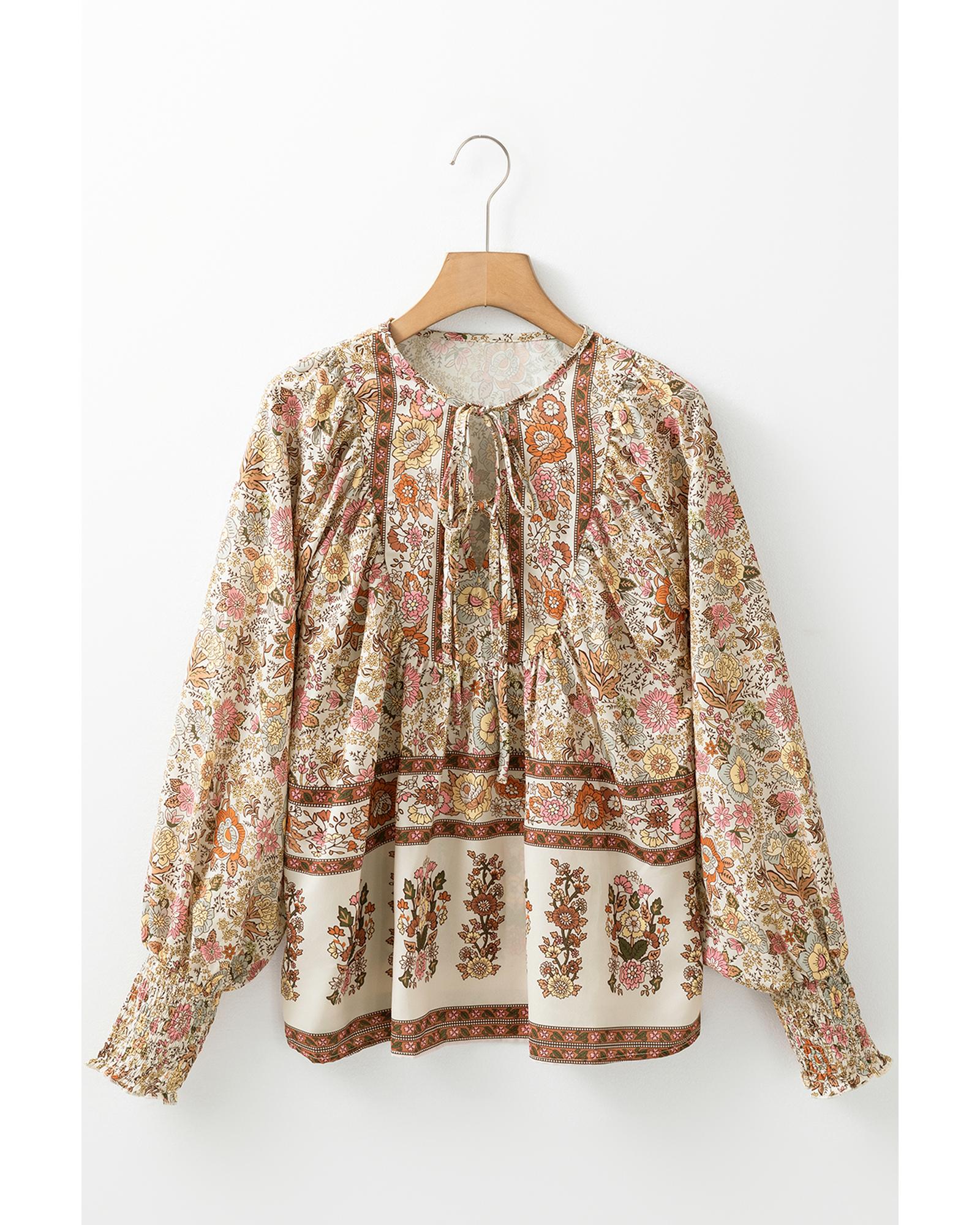 - Yellow floral print tie neck lantern sleeve blouse