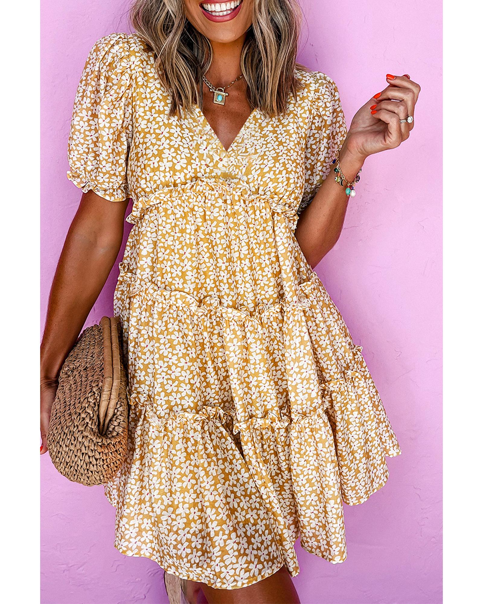 Yellow Floral Short Sleeve V Neck Frilly Tiered Mini Dress – XL