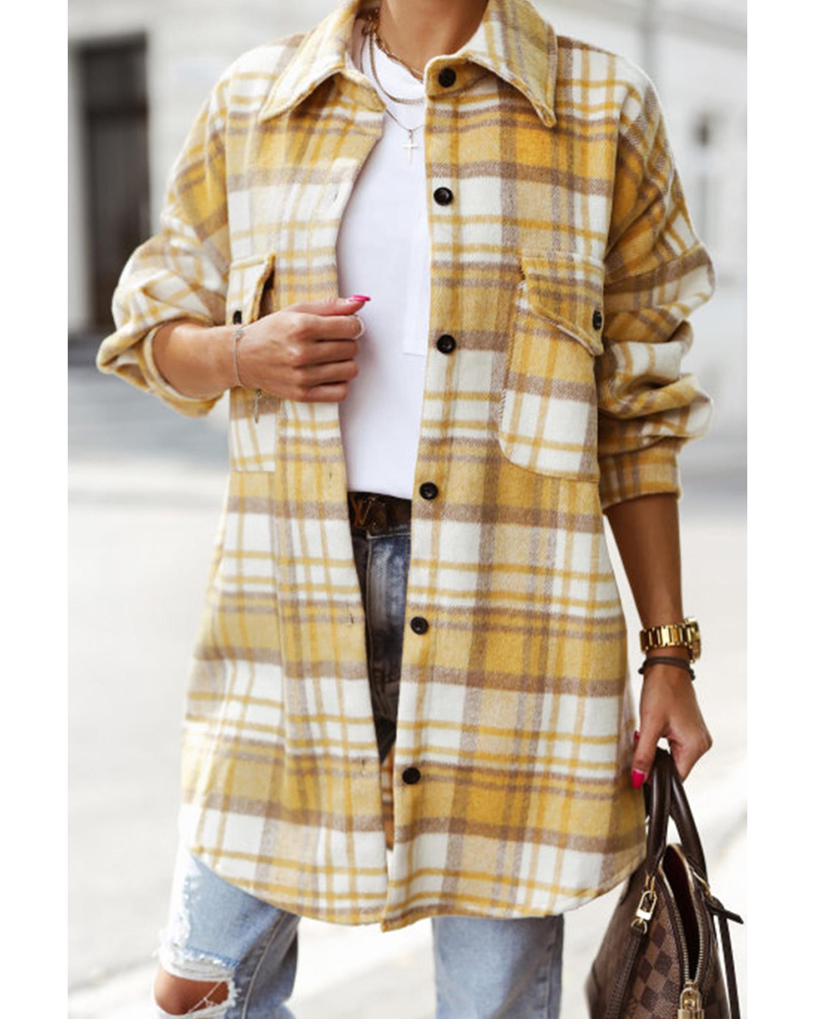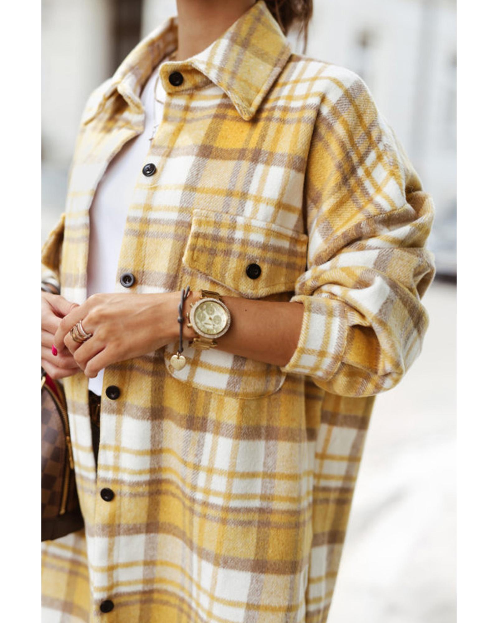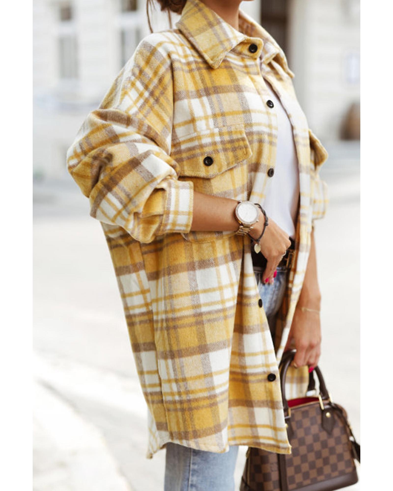Yellow Plaid Flap Pocket Long Sleeve Shacket – L