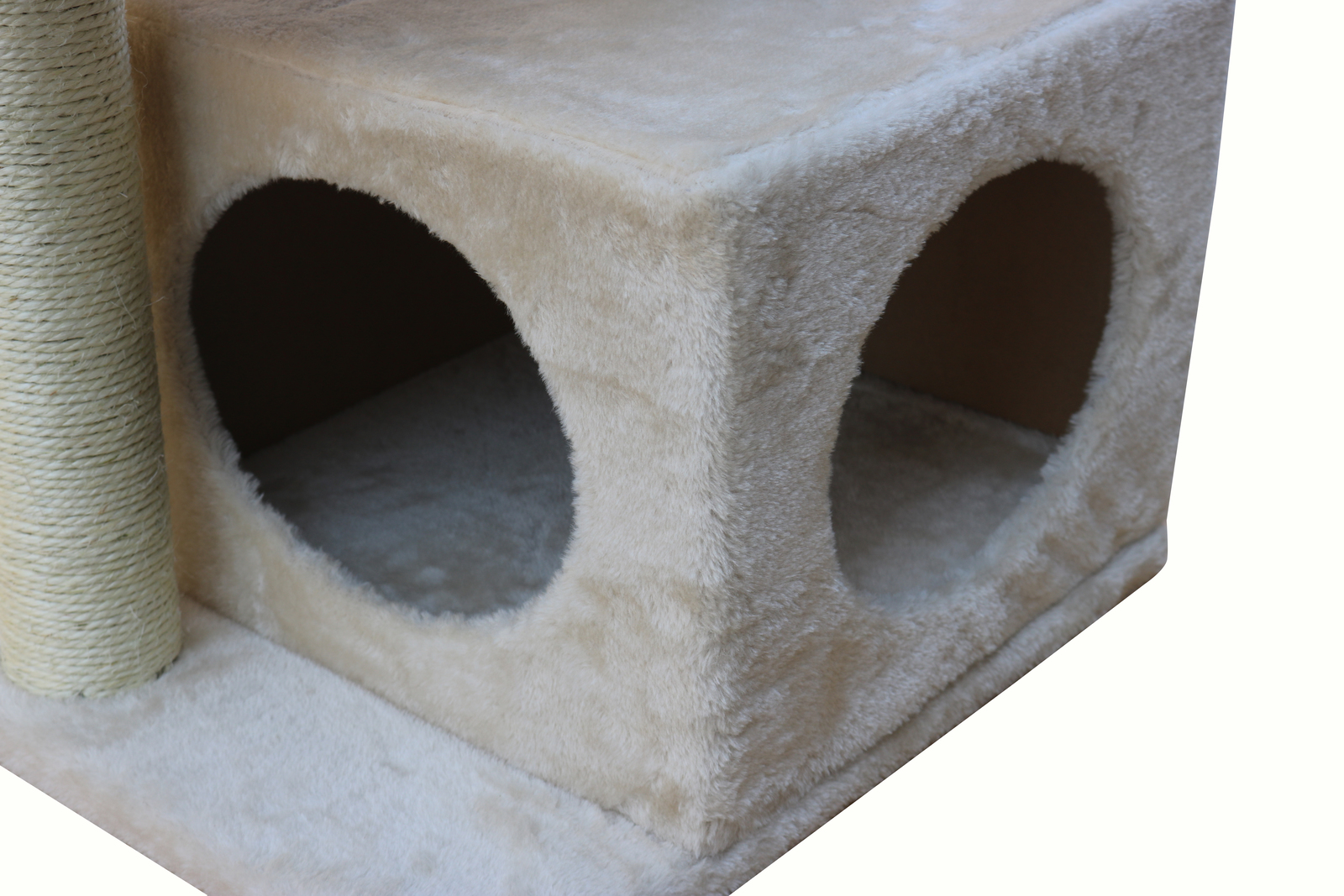 There is a resting box at the bottom of the tree to provide some shelter. The tubes are wrapped with sisal ropes for your pets to scratch and play with. The sturdy base prevents any swaying so it is safe on any flat surface so you do not have to worry about injury to your cat. The stylish cat tree will blend in with your decor.