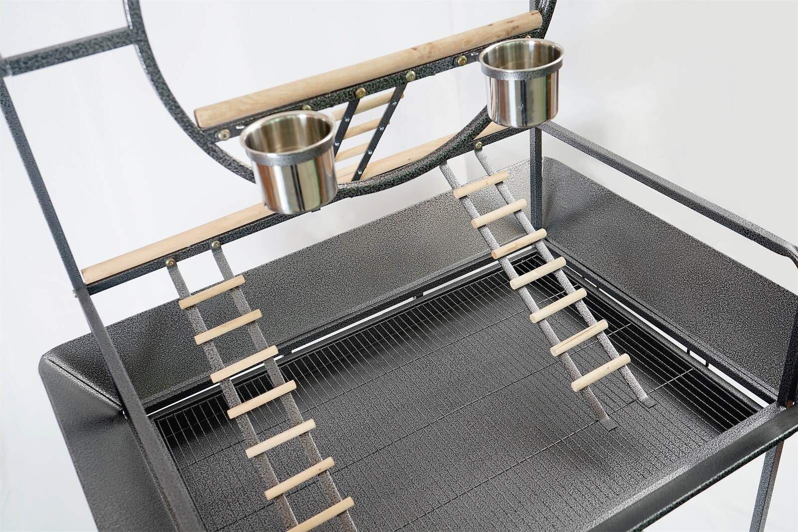 • Metal play ring in center, multiple wooden perches for resting plus 2 stainless steel bowls for food and water